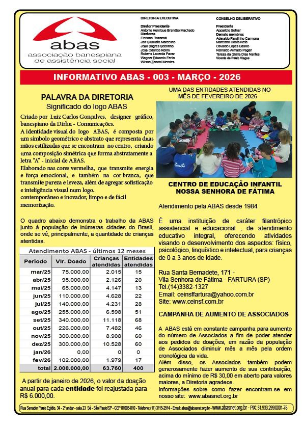 A partir de Janeiro/2026, o valor da doação anual para as entidades será reajustado para R$ 6.000,00.