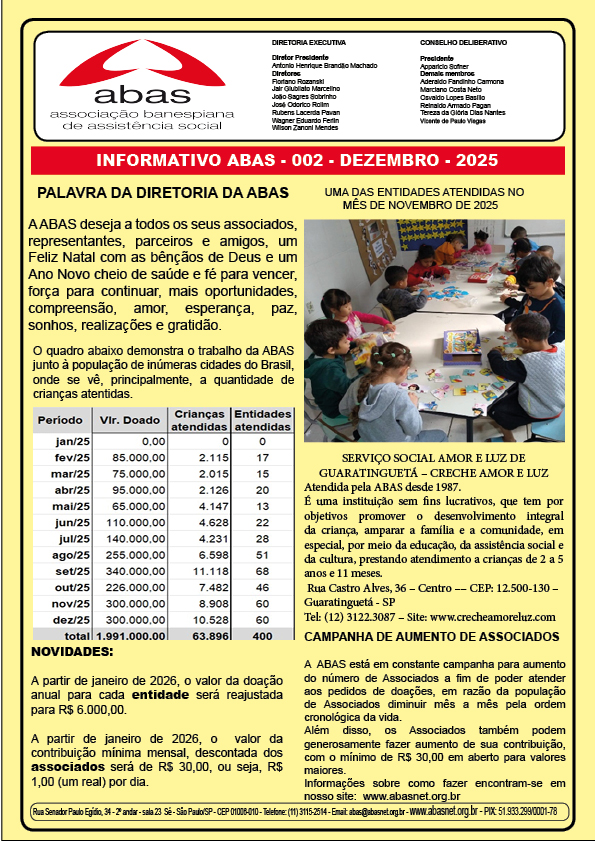 A partir de Janeiro/2026, o valor da doação anual para as entidades será reajustado para R$ 6.000,00.